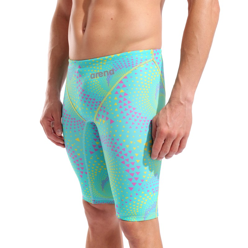 Turn heads in this eye-catching racing suit that channels the energy of the sea with a bold, hypnotic design. Feel the difference in the updated men's racing jammer arena Fireflow Seaglass Limited Edition Powerskin ST Next. It is the first-ever World Aquatics (FINA)-approved racing suit made with recycled fabrics.